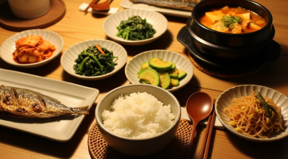 저녁: 밥 한 공기 + 국 + 반찬 3가지 + 후식(과일)